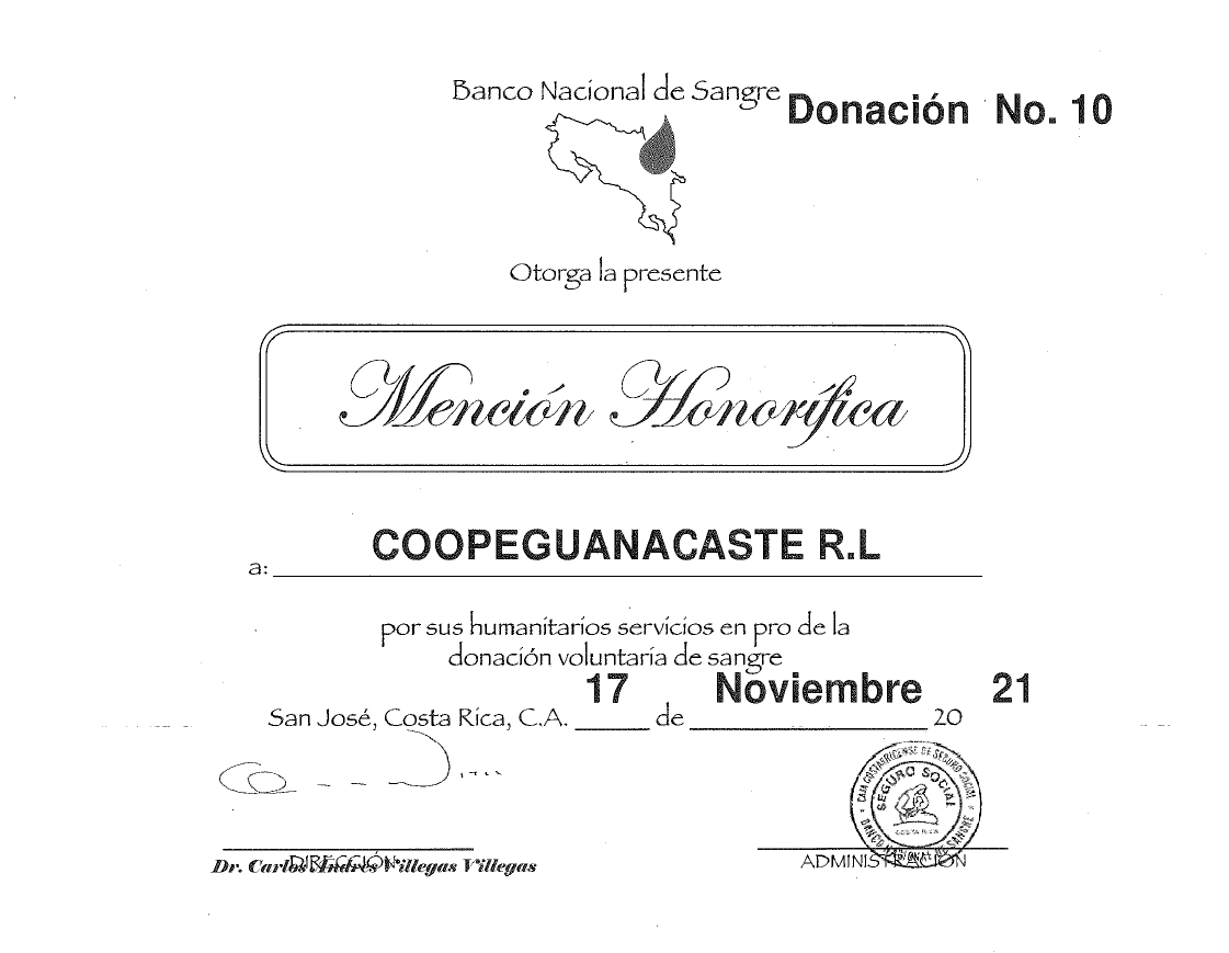 Coopeguanacaste, R.L. recibió una mención honorífica de parte del Banco de Sangre de la Caja Costarricense de Seguro Social (CCSS) por su labor de diez años realizando esta campaña anualmente.