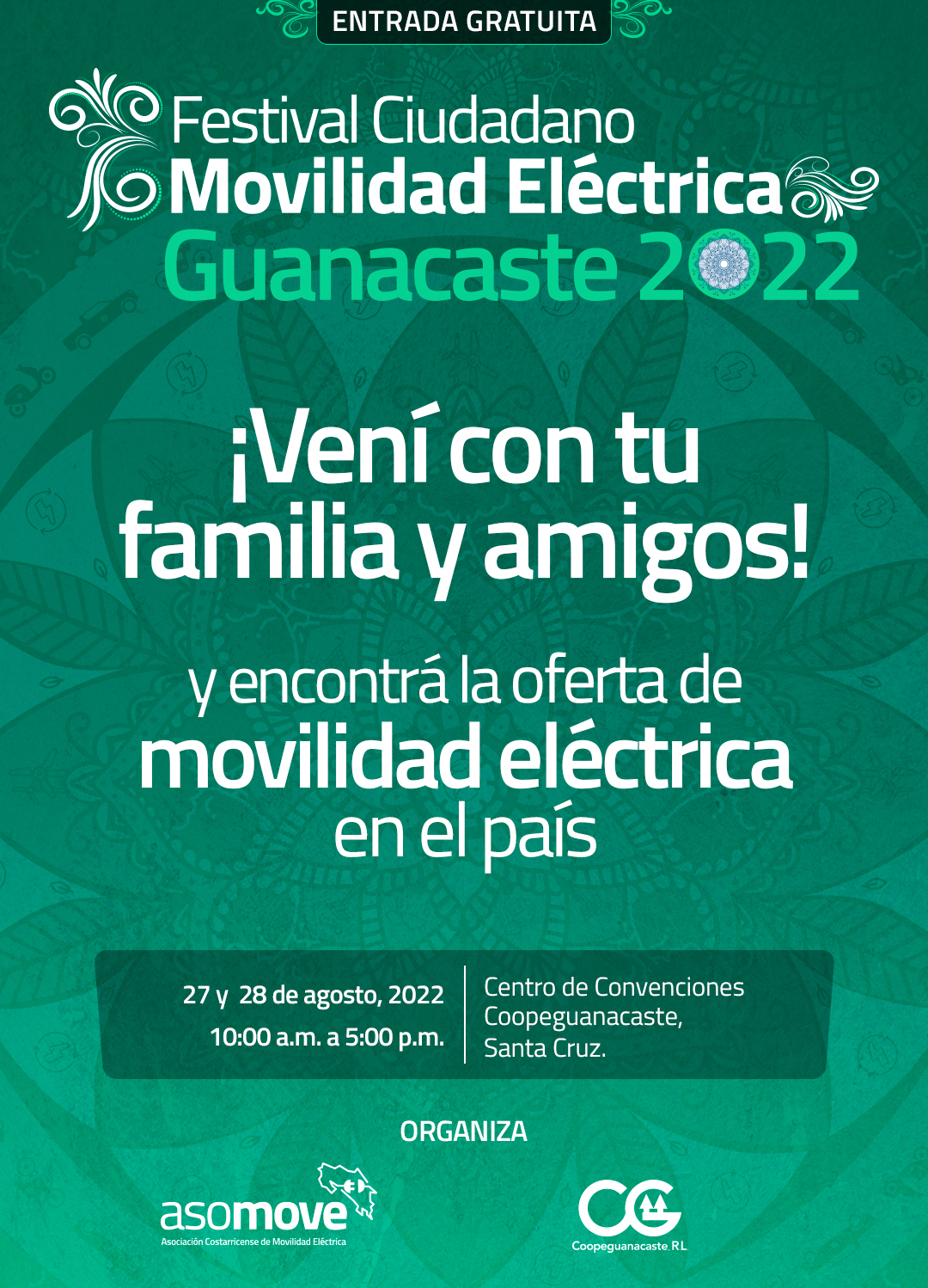 El festival ciudadano de movilidad eléctrica es gratuito y abierto al público. Se realizará el 27 y 28 de agosto en el Centro de Convenciones de Coopeguanacaste en Santa Cruz, con horario de 10:00am a 5:00pm. El evento contará con música y marimba, así como puestos de comida típica guanacasteca.